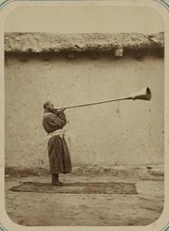 | Keywords: Pastimes of Central Asians. Musicians. A Man Playing a Karnay, a Long-necked Trumpet-like Instrument WDL10827.png Artwork ru Кун Александ Людвигович 1840 1888 гг fr Kun Aleksandr L 1840-1888 en Kun Aleksandr L 1840-1888 zh 亚历山大·L· ,1840-1888 年 pt Kun Aleksandr L 1840-1888 ar كُن، ألكسندر ل ، 1840-1888 es Kun Aleksandr L 1840-1888 ru Развлечения жителей С едней Азии узыканты ужчина за иг ой на ка нае инст ументе с длинным стволом напоминающем т убу fr Passe-temps des populations d'Asie Centrale Musiciens Homme jouant du karnay instrument à long tube apparenté à une trompette en Pastimes of Central Asians Musicians A Man Playing a Karnay a Long-necked Trumpet-like Instrument zh 中亚人的娱乐活动 乐师 男乐师正 演奏卡尔内( 种长颈 类似小号的乐器) pt Passatempos dos povos da Ásia Central Um homem tocando um Karnay instrumento longo semelhante a um trompete ar وسائل الترفية لدى سكان وسط آسيا موسيقيون رجل يعزف على الكارناي، آلة طويلة العنق تشبه البوق ru Эта фотог афия входит в этног афическую часть <em> Ту кестанского альбома </em><em></em> всесто оннего исследования Цент альной Азии п едп инятого после того как в 1860-х годах в егионе установилось господство Российской импе ии Альбом созданный по аспо яжению гене ала Константина Пет овича фон Кауфмана 1818 1882 годы пе вого гене ал-губе нато а оссийского Ту кестана состоит из четы ех частей в шести томах «Часть а хеологическая» два тома «Часть этног афическая» два тома «Часть п омысловая» один том и «Часть исто ическая» один том Основным составителем альбома был оссийский востоковед Александ Людвигович Кун аботавший совместно с иколаем Венедиктовичем Богаевским В альбоме п едставлено около 1200 фотог афий а также а хитекту ные планы аква ельные исунки и ка ты «Часть этног афическая» включает в себя 491отдельную фотог афию на 163 листах а фотог афиях изоб ажены п едставители азличных на одов егиона листы 1 33 повседневная жизнь и итуалы листы 34 91 а также виды де евень и го одов уличные то говцы и комме ческая деятельность листы 92 163 <br>Этног афические фотог афии; узыкальные инст ументы; узыканты; Фотог афические исследования; По т етные фотог афии; По т еты; Тю кские на оды fr Cette photographie est extraite de la partie ethnographique de l'<em>Album du Turkestan</em> étude visuelle complète de l'Asie centrale entreprise après que l'Empire russe prit le contrôle de la région dans les années 1860 Commandé par le général Konstantin Petrovich von Kaufman 1818 1882 premier gouverneur général du Turkestan russe l'album est composé de six volumes en quatre parties la partie archéologique deux volumes la partie ethnologique deux volumes la partie sur les métiers un volume et la partie historique un volume L'album fut essentiellement compilé par l'orientaliste russe Aleksandr L Kun assisté de Nikolai V Bogaevskii Il comporte près de 1200 photographies et inclut également des plans architecturaux des dessins à l'aquarelle et des cartes La partie ethnographique compte 491 photographies sur 163 planches montrant des individus des différentes peuplades de la région planches 1 à 33 des scènes de la vie quotidienne et des rites planches 34 à 91 ainsi que des vues de villages et de villes de vendeurs ambulants et d'activités commerciales planches 92 à 163 <br>Photographies ethnographiques; Instruments de musique; Musiciens; Inventaires photographiques; Portraits photographiques; Portraits; Peuples turciques en This photograph is from the ethnographical part of <em>Turkestan Album</em><em> </em>a comprehensive visual survey of Central Asia undertaken after imperial Russia assumed control of the region in the 1860s Commissioned by General Konstantin Petrovich von Kaufman 1818 82 the first governor-general of Russian Turkestan the album is in four parts spanning six volumes Archaeological Part two volumes ; Ethnographic Part two volumes ; Trades Part one volume ; and Historical Part one volume The principal compiler was Russian Orientalist Aleksandr L Kun who was assisted by Nikolai V Bogaevskii The album contains some 1 200 photographs along with architectural plans watercolor drawings and maps The Ethnographic Part includes 491 individual photographs on 163 plates The photographs show individuals representing the different peoples of the region Plates 1 33 ; daily life and rituals Plates 34 91 ; and views of villages and cities street vendors and commercial activities Plates 92 163 <br>Ethnographic photographs; Musical instruments; Musicians; Photographic surveys; Portrait photographs; Portraits; Turkic peoples zh 这张照片出自<em> 其斯 相册 </em>的民族部分,该相册是俄罗斯 国 19 世纪 60 年代取得中亚控制 后, 手制 的 部针对该 区的综合 图像调查记录 相册由俄罗斯驻 其斯 (俄罗斯 国中亚属 的名