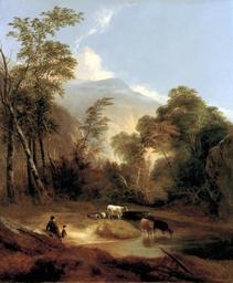 Keywords: Pastoral Landscape by Alvan Fisher, 1854.jpg Artwork Creator Alvan Fisher Pastoral Landscape 1854 oil on canvas cm 61 1 51 White House Washington D C United States Notes from Kloss William et al Art in the White House A Nation's Pride Washington D C The White House Historical Association 2008 <br> In a protected glen Fisher interjects three cows and three sheep that graze drink or stand quietly under the care of a seated shepherd and his dog Nothing moves save a distant mountain cataract whose sound does not reach us Nothing disturbs the calm The artist has in some places blurred the leaves of the trees probably by splaying the bristles of his brush producing a sense of air and delicacy The White House Historical Association PD-art Other versions http //www whitehouseresearch org/assetbank-whha/action/viewAsset id 234 <gallery> </gallery> PD-old-100 Landscape paintings by Alvan Fisher 1854 paintings Paintings in the White House