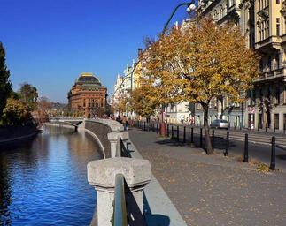 Keywords: path pavement autumn trees river vltava prague czech republic republic building city classics europe theater national tree concrete sky blue foliage