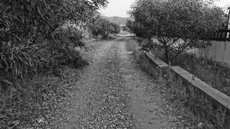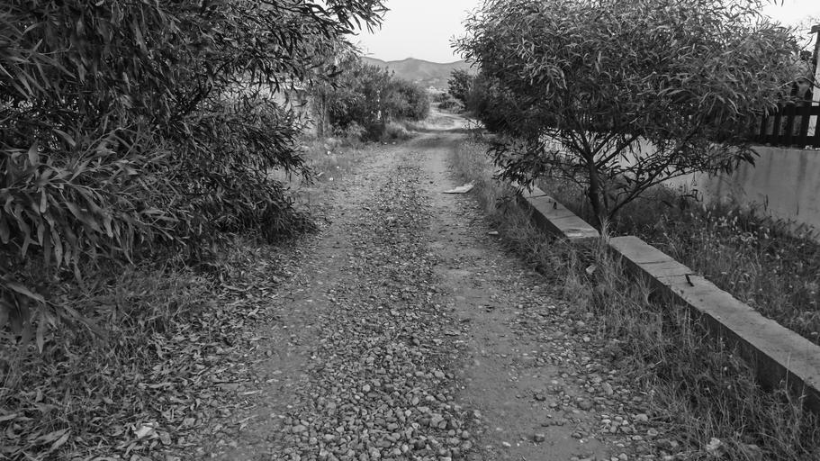 Keywords: path road track field landscape summer black black white black and white picture photography village stones tree pebbles
