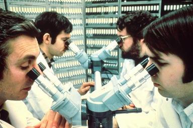 | Keywords: Pathologists looking into microscopes.jpg Four male scientists all seated and looking through at a four-headed microscope They are all wearing white lab coats The simultaneous examination of tissue from a difficult case assists pathologists in their diagnosis Topics/Categories People -- Adult People -- Health Professional Science and Technology -- Laboratory Techniques/Equipment Type Color Photo Source National Cancer Institute Linda Bartlett photographer 2019 1980 Reuse Restrictions None - This image is in the public domain and can be freely reused Please credit the source and/or author listed above Linda Bartlett photographer PD-USGov-HHS-NIH Media from National Cancer Institute Visuals Online Images uploaded by Fæ People with microscopes |