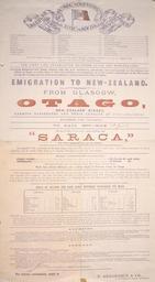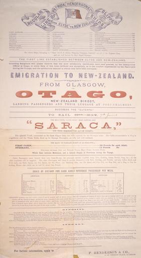 Keywords: document text Arrangement of text, with flag of the Patrick Henderson Shipping Company in scroll at top. Includes a table showing "Scale of dietary for each adult steerage passenger per week", as well as regulations about deposits, luggage allowances, and the fares for first cabin and steerage. Lists at the top, the names of the ships in the Patrick Henderson line. Quantity: 1 colour photo-mechanical print(s). Physical Description: Letterpress, 476 x 257 mm. Patrick Henderson & Co. :Emigration to New Zealand from Glasgow. The beautiful Clyde-built iron clipper ship "Saraca" / P Henderson & Co. [1884].. Ref: Eph-C-IMMIGRATION-1884-01. Alexander Turnbull Library, Wellington, New Zealand. natlib.govt.nz/records/23113318 Arrangement of text, with flag of the Patrick Henderson Shipping Company in scroll at top. Includes a table showing "Scale of dietary for each adult steerage passenger per week", as well as regulations about deposits, luggage allowances, and the fares for first cabin and steerage. Lists at the top, the names of the ships in the Patrick Henderson line. Quantity: 1 colour photo-mechanical print(s). Physical Description: Letterpress, 476 x 257 mm. Patrick Henderson & Co. :Emigration to New Zealand from Glasgow. The beautiful Clyde-built iron clipper ship "Saraca" / P Henderson & Co. [1884].. Ref: Eph-C-IMMIGRATION-1884-01. Alexander Turnbull Library, Wellington, New Zealand. natlib.govt.nz/records/23113318 |