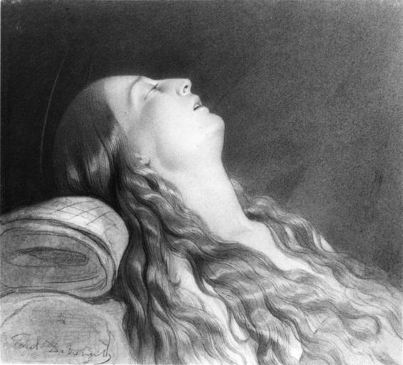 | Keywords: Paul Delaroche - Study for "Louise Vernet on Her Death Bed" - Walters 371379.jpg Paul Delaroche created a convincing and transcendent image of his dead wife in Louise Vernet on her Death Bed Louise lays blissfully in profile as both her mouth and right eye remain slightly open Her elevated head rests on two pillows as locks of her hair fall vertically to her shoulder and drape diagonally across her bosom Delaroche carefully defined each curl delineating individual hairs and shimmering highlights in Louise's palpable coiffure Her pale skin and her lifeless body indicate that she is deceased Rather than present the sordid details of death by fever Delaroche conveyed Christian triumph over death as a halo emerges from the dark background to encircle his wife's beautiful head This drawing is an angelic effigy ca 1845 graphite on slightly textured moderately thick cream wove paper with watermark cm 14 9 17 1 accession number 37 1379 13453 Goupil Paris William T Walters Baltimore May 18 1867 by purchase Henry Walters city Baltimore Walters Art Museum Henry Walters Acquired by William T Walters 1867 Paul Delaroche in graphite lower left recto; Paul Delaroche in graphite right side verso; 6467 in graphite center verso; 27 in graphite upper right verso; partially trimmed Whatman watermark visible in raking light lower edge of drawing verso The Essence of Line place of origin France Walters Art Museum license 2D Paul Delaroche Drawings in the Walters Art Museum Louise Vernet 1845 Deathbeds in art Deathbed portraits 1845 Paintings of female corpses Studies art The Essence of Line |