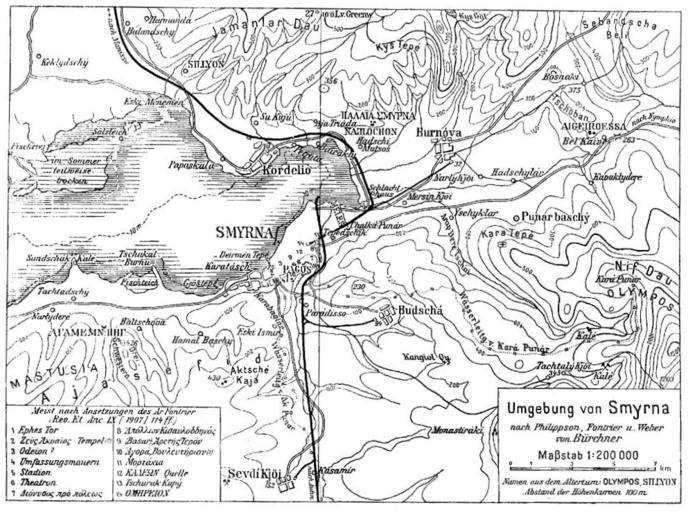 Keywords: Pauly-Wissowa III A,1, 0747 Map Smyrna.png Umgebung von Smyrna nach Philippson Fontrier und Weber von Bürchner Paulys Realencyclopädie der classischen Altertumswissenschaft Band III A 1 Sp 749-750 1927 Ludwig Bürchner PD-old Paulys Realencyclopädie der classischen Altertumswissenschaft Band III A 1 Maps of Izmir Maps from Pauly-Wissowa |