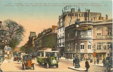 Keywords: Pavillon Hanovre Italiens.jpg en The Pavillon du Hanovre in its original place on the Boulevard des Italiens Paris fr Le Pavillon de Hanovre à son emplacement originel sur le Boulevard des Italiens Orfèvrerie Christofle Old post card Jean-Michel Chevotet 1910 env thumb left fr <-- Etat actuel au parc de Sceaux en <-- Now in parc de Sceaux near Paris 48 52 15 79 N 2 20 1 99 E heading SE PD-old Historical images of Boulevard des Italiens 1910 circa Credit Lyonnais HQ Italiens Pavillon de Hanovre 1910 circa Christofle Pavillon de Hanovre 1910 circa Paris in the 1910s Postcards of Paris Historical buses in France Colored postcards |