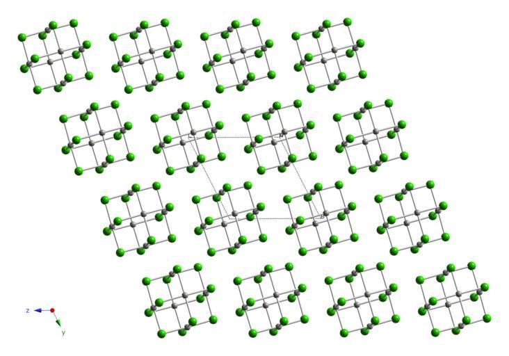 Keywords: Pd6Cl12-xtal-1996-CM-3D-balls.png Ball-and-stick model of part of the crystal structure of the beta polymorph of palladium II chloride PdCl<sub>2</sub> Colour code Palladium Pd grey Chlorine Cl green Crystal structure from http //dx doi org/10 1002/anie 199613311 Angew Chem Int Ed 1996 35 1331 1333 Model constructed and image generated in http //www crystalmaker com/ CrystalMaker 8 2 Own 2010-06-17 Ben Mills Benjah-bmm27 Images by Ben Mills Crystal structure of the beta polymorph of palladium II chloride |