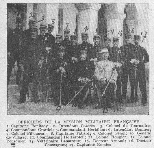 | Keywords: PdG 14 Athènes photo de groupe 7 mars 1915.jpg fr Mission militaire française en 1914 en Gréce commandée par le général de Villaret avec 1 le cap Bonifacy 2 l'intendant Cazerès 3 col de Tournadre 4 com Grardel 5 com Herbillon 6 int Bonnier 7 col Fillonneau 8 cap Tabard 9col Génin 10 de Villaret 11com Holtzapfell 12col Rougier 13col Bousquier 14vét Lamarque 15 D Arnaud 16 D Cousergues cap Romieu Pages de Gloire numéro 14 photographe de presse inconnu 7_mars_1915 mais la photographie doit remonter à avril-juillet 1914 PD-old Étienne de Villaret Pages de Gloire 1914 in Greece Relations of France and Greece Black and white group photographs of men Black and white portrait photographs of military people in uniform |