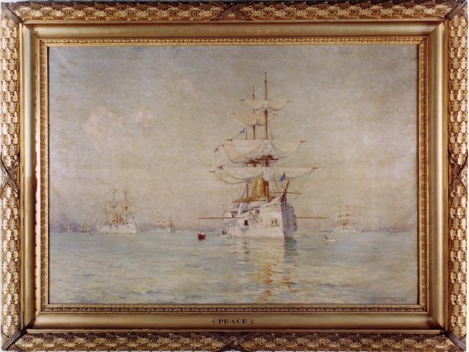 | Keywords: Peace - Walter L Dean.jpg en Peace The White Squadron in Boston Harbor was painted by Walter Lofthouse Dean in 1893 It depicts American warships performing exercises and maneuvers Chicago the largest ship is in the foreground; behind her are the cruisers Atlanta Boston and Newark and the gunboat Yorktown Other vessels and the city of Boston including the Massachusetts State House dome and Bunker Hill Monument appear in the distance Peace was first hung in the Capitol in 1900 in the room of the House Committee on Naval Affairs The painting remained with the committee throughout various relocations in the Capitol and in 1919 to the Cannon House Office Building; Peace is now on view in room 311 and has been recently restored Walter Lofthouse Dean 1854-1912 was born in Lowell Massachusetts and later established studios in Boston and Gloucester to paint fishing and harbor scenes He is regarded as one of the leading American marine painters Architect of the Capitol www capitol gov/html/IMG_2010061786143 html Architect of the Capitol Walter L Dean 1891-01-01 PD-EdictGov 19th-century sailing ships in paintings Cannon House Office Building 1893 paintings Template artwork possible |