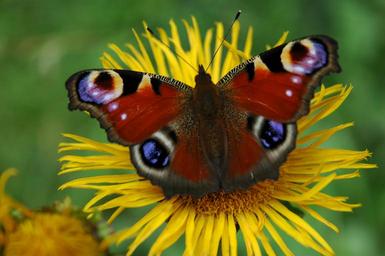 Keywords: peacock butterfly blossom bloom yellow macro butterfly flower peacock close