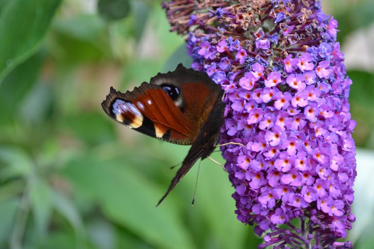 Keywords: peacock butterfly butterfly inachis io drinking nectar european buddlehia buddleja purple flower butterfly bush wings open circles on wings close-up