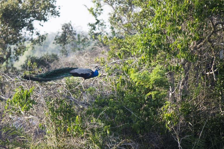 Keywords: peacocks blue peafowls wildlife birds indian forests greenery leaves leafy woods wooden trunks plants natural parks exotic plumage feathers male elegant endangered rare