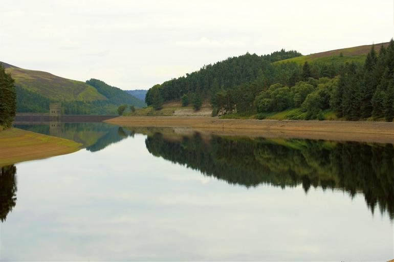 Keywords: peak district reservoir howden reservoir dam howden dam 617 squadron dam busters trees calm water reflections