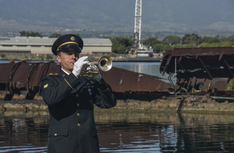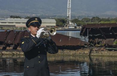 Keywords: Pearl Harbor ceremony 150106-N-GI544-059.jpg en A bugler assigned to the Hawaii Army National Guard plays taps during an ash scattering ceremony for Bugler Master Tech Sgt Allen Bodenlos a Pearl Harbor survivor on Joint Base Pearl Harbor-Hickam Jan 6 Bodenlos ™s ashes were scattered in the waters near the USS Utah Memorial U S Navy photo by Mass Communication Specialist 2nd Class Laurie Dexter/Released 2015-01-06 Petty Officer 2nd Class Laurie Dexter https //www dvidshub net/image/1717689 150106-N-GI544-059 2015-01-09 14 00 PEARL HARBOR HI US PD-USGov-Military-Navy 2015 in Pearl Harbor People at Pearl Harbor Hawaii Army National Guard USS Utah Memorial Images from DoD uploaded by Fæ Taps bugle call |