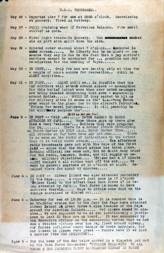 | Keywords: pearl harbor pearlharbor attack december 7 1942 december71942 world war two worldwartwo text document writing Document from the Pearl Harbor Dispatch Special Collection which details the attack and the days following it. Repository: San Diego Air and Space Museum Archive Document from the Pearl Harbor Dispatch Special Collection which details the attack and the days following it. Repository: San Diego Air and Space Museum Archive | ||||
