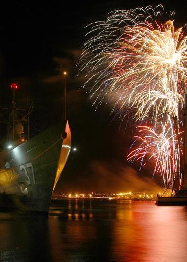 Keywords: pearl harbor hawaii ships fireworks celebration festive shoreline lights bay harbor port water reflections beautiful night evening colorful sky outside navy military