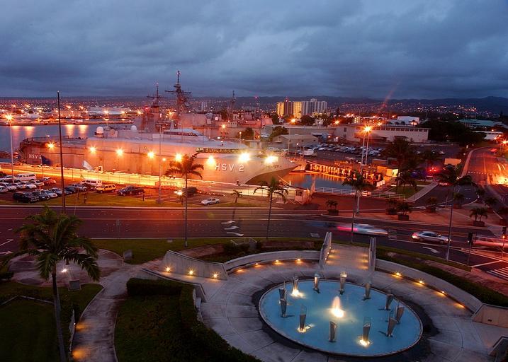 Keywords: pearl harbor hawaii sky clouds bay port harbor sea ocean water nature outside ships military navy street buildings tropics tropical night evening lights