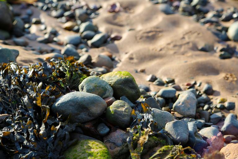 Keywords: pebbles seaweed beach sand holiday share coast ocean nature kelp coastline