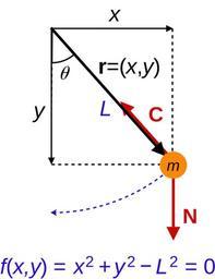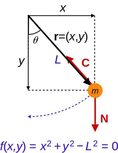| Keywords: Pendulum constraint.svg en Simple pendulum Since the rod is rigid the position of the bob is constrained according to the equation f x y 0 the constraint force is C and the one degree of freedom can be described by one generalized coordinate here the angle theta 2015-08-28 own Maschen other versions cc-zero Uploaded with UploadWizard Classical mechanics Pendulums |