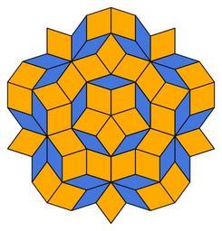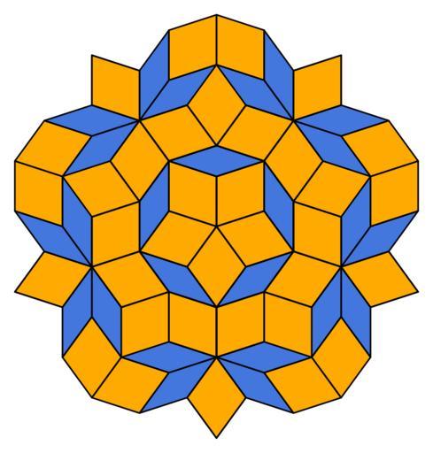 Keywords: PenroseTilingFilled3.svg en 3rd iteration of L-system of Penrose tiling cs 3 iterace L-systému Penroseova dláždění own NightElfik Generated with <pre>PenroseTilingFilled axiom + 18 N++N++N++N++N; angle 36; palette 000 47d fa0; polyReverse 1; lateLinesDraw 1; step 32; i 3; margin 16; M > O++ 1 P ----N -O ----M ++; N > + 2 O --P ---M --N +; O > - 2 M ++N +++O ++P -; P > -- 1 O ++++M +P ++++N --N; </pre> L-Systems Penrose tilings Files by User NightElfik 5-fold rotational symmetry Geometry images with dihedral symmetry 05 Order 3