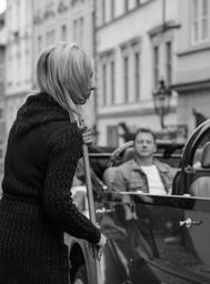 Keywords: pensive woman passenger car street life city man black white