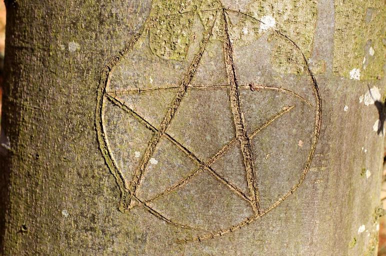 Keywords: pentacle paganisch symbol eingeritzter tree star tree engraved bark log close pentagram five pointed star tree bark