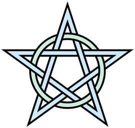 | Keywords: Pentagram-circle-interlaced.svg Ornamental interlaced pentagram and circle topologically equivalent to File Pentagonal-knot svg Self-made graphic based on abstract geometry a circle with radius 150 and a pentagram with its outer vertices 250 units from the center both stroked with an outer width of about 32 and an inner width half that So converted from a version of the following vector PostScript source code <pre> 306 396 translate/plr 250 dup 3 2 roll 72 mul 90 add dup 3 1 roll cos mul 3 1 roll sin mul def/A 0 0 150 0 360 arc closepath stroke 3 plr 1 plr 4 plr 2 plr 0 plr moveto 4 lineto repeat closepath stroke def 32 setlinewidth A 1 setgray 16 setlinewidth A showpage EOF</pre> 2009 AnonMoos 2 component links Decorative knots Pentagrams 5-fold rotational symmetry 15 crossing number knots and links Outline knots and links Images with PostScript source code |