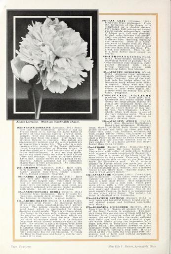 | Keywords: Peonies for pleasure (16208627120).jpg  Alsace Lorraine With an indefinable charm <br> 163  ALSACE LORRAINE Lemoine 1906 Semi- <br> rose type; late midseason Evidently has La <br> France blood in it having the same habit of <br> growth of that famous variety; growth erect <br> upright with the foliage standing off in a <br> marked way from the plant Very large im- <br> bricated flowers in clusters The petals are <br> pronouncedly pointed and the center petals are <br> arranged like a water lily The color is a rich <br> creamy-white center of the flower delicately <br> tinted brownish-yellow or Havana brown; is <br> best described as a fried butter color of a pe- <br> culiar reddish-brown A very striking shade <br> unlike any other Peony we know except Claude <br> Gelee and Solange A most attractive flower <br> Extra fine Easily scores the six points of ex- <br> cellence Alsace Lorraine has an indefinable <br> charm that is very pronounced No collection <br> is complete without it <br> 281  AMAZOIVE  Lemoine 1S99 Rose type; <br> early midseason Well formed Large perfect <br> flower guards rosy-white center creamy- <br> white flecked crimson; fragrant <br> 98  ANDRE LAURIES Crousse 1881 Rose <br> type; very late Very dense compact globular <br> bloom of the largest size Color dark tyrian- <br> rose or solferino-red shading deeper in the <br> center with red reflex; guards same color oc- <br> casionally splashed with green center mottled <br> with white An all around good Peony <br> 37  ANEMONEFLORA RUBRA Guerin 1854 <br> Anemone type; midseason Deep brilliant ty- <br> rian-rose carpels dark crimson Strong tall <br> free bloomer in clusters A good variety <br> 540  ARCHIE BRAND Brand 1913 Bomb type; <br> midseason prize Peony An enormous flower <br> of an even deep seashell-pink with silvery <br> border The petals closely massed form a <br> solid head which is surrounded by broad <br> drooping guard petals There is a charm about <br> this flower in its even soft uniform color and <br> the peculiar perfection of its form which at- <br> tracts the eye from a long distance One of <br> the chief attractions about it is its delicate <br> fragrance which closely resembles that of the <br> Rose We believe it has a stronger true Rose <br> fragrance than any other pink variety This <br> delightful fragrance added to the charming <br> beauty and grace of the flower makes this va- <br> riety especially fine for cut blossoms It rivals <br> the Rose in fragrance and beauty and far sur- <br> passes it in size <br> 102  ASA GRAY Crousse 1SS6 <br> Semi-rose type; midseason Prom <br> the formation of the flower it is <br> designated as a double decker <br> Very large full imbricated bloom; <br> guard petals salmon-flesh center <br> of bloom very full and perfectly <br> formed; color delicate lilac plente - <br> ously sprinkled with minute dots <br> of deeper lilac Striking imposing <br> and beautiful Here is a flower <br> you want to linger over No Peony <br> produces more bloom year in and <br> year out than does Asa Grav Fra- <br> grant and distinct This variety <br> at a local flower show swept the <br> boards <br> 84  A TROSAX GUINEA Calot <br> 1850 Semi-double; midseason A <br> marvelous flower of globular form <br> Color brilliant rosy-magenta outer <br> guards streaked with white <br> Strong vigorous grower with <br> spreading habit; free bloomer <br> 23  AUGUSTE LEMOND2R Calot <br> 1865 Anemone type; midseason <br> Superb brilliant red with velvety <br> finish; fragrant One of the very- <br> best reds for hedge effect or for <br> landscape work where color effect <br> is desired Many who saw this <br> superb variety in our nurseries in <br> bloom in June were highly im- <br> pressed with its beauty and great <br> value Fragrant <br> 170  A UGUSTE VILLAUME <br> Crousse 1895 Rose type; late <br> Enormous full round bloom with <br> closely set large petals; indeed the <br> petals are unusually large for a <br> Peony A uniform color through- <br> out the entire flower of rich vio- <br> let-rose Very fragrant A Peony <br> which when well done is one of <br> the very fetching sorts This and <br> all late sorts need watering to <br> properly develop them <br> 22S  AUGUSTIN d'HOUR Calot <br> 1867 Syn Marechal MacMahon <br> Bomb type; midseason Extremely <br> large showy perfectly built bloom; primary <br> petals narrow and built up close and high <br> Color very deep rich brilliant solferino-red <br> with slight silvery reflex; the largest of all <br> red Peonies Indispensable This is as high <br> class a Peony in its way as Felix Crousse al- <br> though they are entirely distinct and in no <br> way conflict It is a taller grower and larger <br> flower than Felix Crousse <br> 17  AURORE Dessert 1904 Semi-rose type; <br> late Extra large flat loose bloom Color <br> lilac-white with collar of milk-white flecked <br> with crimson guards prominently flecked car- <br> mine The very center of the bloom is of the <br> same shade as the guards Fragrant Superb <br> Commenting on this variety at the New York <br> Show Mr Bonnewitz said Mr G made a <br> display of Aurore which just made you think <br> of an early spring morning When I first saw <br> it I involuntarily said 'Sunrise ' and a learned <br> friend at my elbow said 'Exactly right for <br> that is what Aurore means ' <br> 132  AVALANCHE Crousse 18S6 Crown type; <br> late midseason It has taken some people a <br> number of years to tumble to the fact that <br> this is a first-class Peony This magnificent <br> variety opens like a rose bud Color pure <br> snow-white with a few delicate pencilings <br> of carmine on the edge of the central petals; <br> very waxy and chaste; fragrant One of the <br> most superb Peonies in fact it is unsurpassed <br> by any other white Peony The variety Al- <br> batre is identical with Avalanche <br> 574  AVIATEUR REVMOND Dessert 1915 A <br> very large and beautiful flower; bright cherry- <br> red shaded garnet and br