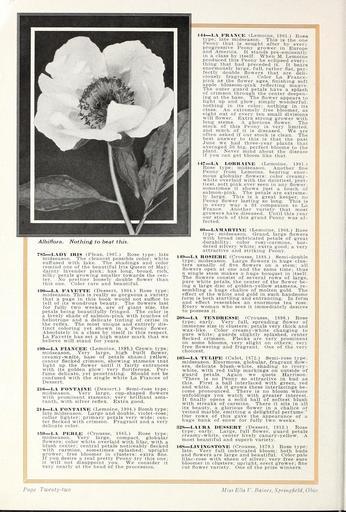 | Keywords: Peonies for pleasure (16370055436).jpg Albi flora Nothing to beat this <br> 785 ” LADY IRIS Pleas 1907 Rose type; late <br> midseason The cleanest possible color; 'white <br> suffused with lake The shadings and color <br> remind one of the beautiful Iris Queen of May; <br> dainty lavender pink; has long broad rich <br> silky petals growing smaller towards the cen- <br> ter No prettier loosely double flower than <br> this one Color rare and beautiful <br> 190 ” LA FAYETTE Dessert 1904 Rose type; <br> midseason This is really so gorgeous a variety <br> that a page in this book would not suffice to <br> tell of its wondrous beauty The flowers last <br> for fully two weeks are of giant size the <br> petals being beautifully fringed The color is <br> a lovely shade of salmon-pink with touches of <br> heliotrope and a delicate tinting of cerise in <br> the reflex The most unique and entirely dis- <br> tinct coloring yet shown in a Peony flower <br> Absolutely in a class by itself in this respect <br> La Payette has set a high water mark that we <br> believe will stand for years <br> 199 ” LA FIANCEE Lemoine 189S Crown type; <br> midseason Very large high built flower <br> creamy-white base of petals shaded yellow <br> center flecked crimson showing stamens that <br> light up the flower until it fairly entrances <br> with its golden glow; very floriferous Per- <br> fume delicate yet penetrating Should not be <br> confused with the single white La Fiancee of <br> Dessert <br> 216 ” LA FONTAINE Dessert Semi-rose type; <br> midseason Very large cup-shaped flowers <br> with prominent stamens; very brilliant ama- <br> ranth with silver reflex Extra good <br> 214 ” LA FONTAINE Lemoine 1904 Bomb type; <br> late midseason Large and double violet-rose; <br> collar lighter; primary petals very wide; cen- <br> ter flecked with crimson Fragrant and a very <br> delicate color <br> 159 ” LA PERLE Crousse 1885 Rose type; <br> midseason Very large compact globular <br> flowers; color white overlaid with lilac with a <br> blush center; central petals noticeably flecked <br> with carmine sometimes splashed; upright <br> grower; free bloomer in clusters; extra fine <br> If you desire a real pretty Peony try this one; <br> it will not disappoint you We consider it <br> very nearly at the head of the procession <br> 144 ” LA FRANCE Lemoine 1901 Rose <br> type; late midseason This is the one <br> Peony that is sought after bv even- <br> progressive Peony grower in Europe <br> and America It stands pre-eminentlv <br> in a class by itself When M Lemoine <br> produced this Peony he eclipsed every- <br> thing that had preceded it It bears <br> enormously large full rather flat per- <br> fectly double flowers that are deli- <br> ciously fragrant Color La France- <br> pink as the flower ages finishing soft <br> apple blossom-pink reflecting mauve <br> The outer guard petals have a splash <br> of crimson through the center deepen- <br> ing at the base The flower appears to <br> light up and glow; simply wonderful; <br> nothing in its color; nothing in its <br> class An extremely free bloomer as <br> eight out of every ten small divisions <br> – will flower Extra strong grower with <br> long stems A glorious flower The <br> stock of this Peony is very limited <br> and much of it is diseased We are <br> often asked if our stock is clean The <br> best answer to this is that the past <br> June we had three-year plants that <br> averaged 30 big perfect blooms to the <br> plant Never mind about the disease <br> if you can get bloom like that <br> 147 ” LA LORRAINE Lemoine 1901 <br> Rose type; midseason Another fine <br> Peony from Lemoine bearing enor- <br> mous globular flowers; color creamy- <br> white overlaid with the daintiest pret- <br> tiest soft pink ever seen in any flower <br> sometimes it shows just a touch of <br> salmon-pink The petals are extreme- <br> ly large This is a great keeper no <br> Peony flower lasting so long This is <br> in every way a fit companion to La <br> France Another varietv that most <br> growers have diseased Until this year <br> our stock of this grand Peonv was af- <br> fected <br> 60 ” LAMARTINE Lemoine 1908 Rose <br> type; midseason Grand large flowers <br> with broad imbricated petals of great <br> durability; color rosy-carmine bor- <br> dered silvery white; extra good; a very <br> attractive and striking Peony <br> 149 ” LA ROSIERE Crousse 1888 Semi-double <br> type; midseason Large flowers in huge clus- <br> ters usually of five flowers on a stem; all <br> flowers open at one and the same time; thus <br> a single stem makes a huge bouquet in itself <br> The flowers consist of several rows of large <br> pure white petals the center of the flower be- <br> ing a large disc of golden-yellow stamens re- <br> sembling a huge chalice of molten gold The <br> effect of the white and gold in such handsome <br> form is both startling and entrancing In form <br> and effect resembles an enormous tea rose <br> Every woman who sees it immediately desires <br> to possess it <br> 208 ” LA TENDRESSE Crousse 1896 Rose <br> type; early Very full spreading flower of <br> immense size in clusters; petals very thick and <br> wax-like Color creamy-white changing to <br> pure white; guards slightly splashed center <br> flecked crimson Flecks are very prominent <br> on some blooms very slight on others; very <br> free flowering and fragrant One of the very <br> choicest <br> 103 ” LA TULIPE Calot 1872 Semi-rose type; <br> midseason Enormous globular fragrant flow- <br> ers delicate blush-white shading to ivory- <br> white with red tulip markings on outside of <br> guard petals Again -we quote Harrison <br> There is no Peony so attractive in bud as <br> this First a ball interlaced with green red <br> and white As it grows these interlacings be- <br> come pronounced There is no bloom whose <br> unfoldings you watch -with greater interest <br> It finally opens a solid ball of
