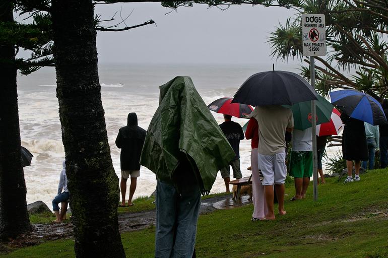 Keywords: people rain watching coast sea ocean storm swell wet tree group queensland australia