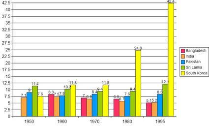 Keywords: Per capita GDP of South Asian economies & SKorea (1950-1995).png GDP per capita of South Asian economies and South Korea as a percent of the American GDP per capita using data from Table 1 http //www eldis org/static/DOC12473 htm 2005-07-16 own http //en wikipedia org/w/index php title Wikipedia Featured_article_review/Economy_of_India/archive2 diff 410296359 oldid 410294540 Pamri GDP bar charts Economic statistics for Bangladesh Economic charts of India Economic statistics for Pakistan Economic statistics for South Korea Economic statistics for Sri Lanka |