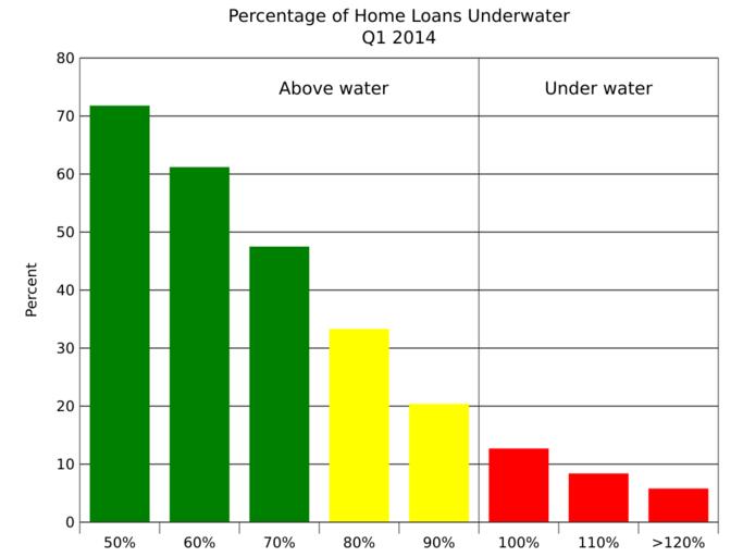 Keywords: Percentage of US Home Loans Underwater Q1 2014.svg translate yes en Percentage of United States home loans underwater 1st quarter 2014 http //www corelogic com/about-us/news/corelogic-reports-312 000-residential-properties-regained-equity-in-q1-2014 aspx The x axis is loan to value LTV 2016-08-11 own Delphi234 other versions cc-zero Mortgage crisis |