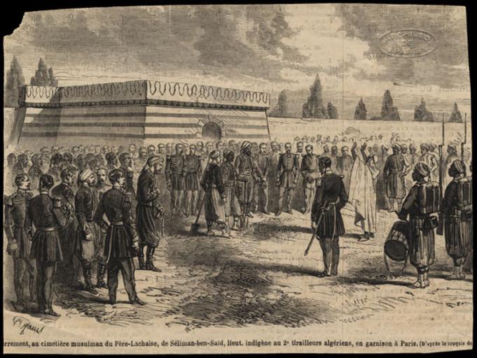 | Keywords: Père-Lachaise - Division 85 - enclos musulman 01.jpg Enterrement dans l'enclos musulman division 85 du cimetière du Père-Lachaise de Séliman-ben-Saïd lieutenant indigène au 2e régiment de tirailleurs algériens en garnison à Paris D'après le croquis de Gideon Baril 1865-04-08 Archives de Paris object history exhibition history credit line accession number 15Fi 582 http //www paris fr/politiques/Portal lut page multimedialist id 214 pnumber 7 page_id 149 pop 1 paris fr cite journal Maxime Vauvert Enterrement de Seliman-ben-Saïd Le Monde illustré 1865-04-08 221 16 417 http //gallica bnf fr/ark /12148/bpt6k6224535d/f12 PD-old Gustave Janet Gédéon Baril Grave of Séliman-ben-Saïd Père-Lachaise Cemetery in the 19th century Engravings of the Père-Lachaise Cemetery 1865 in art |