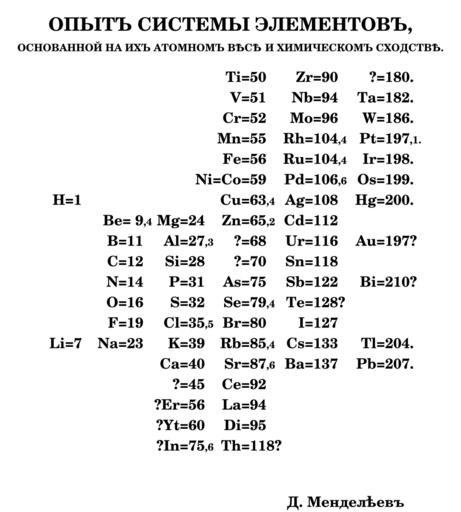 | Keywords: Periodic table by Mendeleev, 1869.svg en Periodic table by Mendeleev 1869 Title translates An experiment on a system of elements based on their atomic weights and chemical similarities non-modern Russian https //en wikipedia org/w/index php title Wikipedia Graphics_Lab/Illustration_workshop diff 655015887 oldid 654975485 2015-04-04 own NikNaks other versions File Mendeleev's 1869 periodic table png facsimile Uploaded with UploadWizard Dmitri Mendeleev Alternative forms of periodic table |