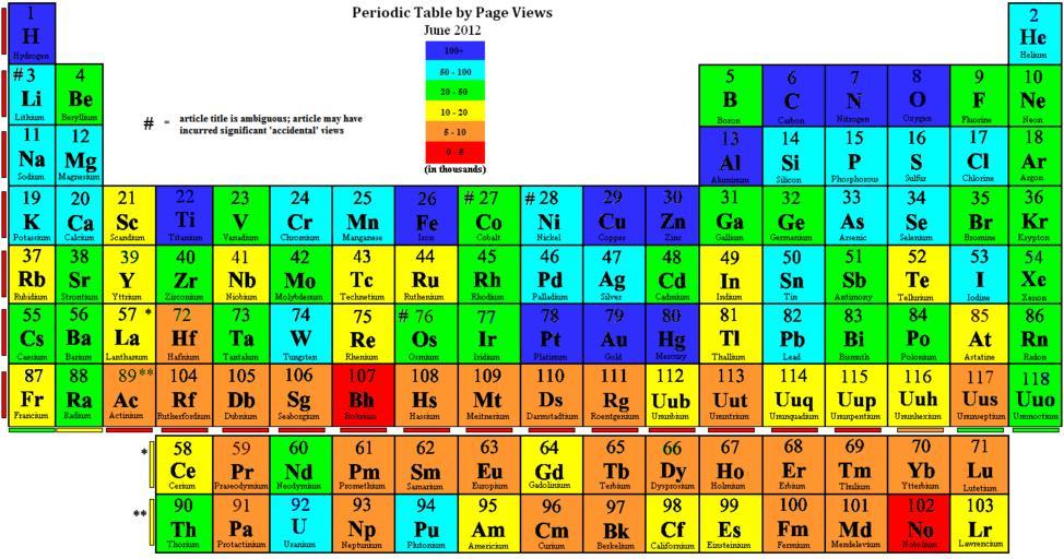 | Keywords: Periodic table by page views.PNG Period Table of the Elements created by User Cryptic C62 color-coded to show the number of page views for in June 2008 the Wikipedia article for each element own original text I created this work entirely by myself 1 2008-08-23 Cryptic C62 · Talk Cryptic C62 Original upload log en wikipedia Periodic+table+by+page+views PNG 2012-09-16 06 29 Double sharp 1345×707× 128109 bytes <nowiki>update for August 2012</nowiki> 2012-08-19 08 57 Double sharp 1345×707× 127955 bytes <nowiki>update for July 2012</nowiki> 2012-07-14 16 28 Double sharp 1345×707× 127786 bytes <nowiki>updated for June 2012 the first time in 2 years the receding dark blue area looks scary</nowiki> 2010-08-25 18 29 Stone 1345×707× 115188 bytes <nowiki></nowiki> 2010-01-13 23 18 Cryptic C62 1345×707× 115536 bytes <nowiki>update for final edition</nowiki> 2009-11-18 20 30 Cryptic C62 1345×707× 117289 bytes <nowiki>update for October edition</nowiki> 2009-09-28 20 10 Cryptic C62 1345×707× 117490 bytes <nowiki>update for August edition</nowiki> 2009-05-15 03 33 Cryptic C62 1345×707× 117427 bytes <nowiki>update for April/May</nowiki> 2009-03-11 01 49 Cryptic C62 1345×707× 118149 bytes <nowiki>adding groups periods actinoids lanthanoids</nowiki> 2009-03-04 22 01 Cryptic C62 1343×707× 119190 bytes <nowiki>update for march 2009</nowiki> 2009-01-07 00 02 Cryptic C62 1343×707× 119901 bytes <nowiki>update for December edition</nowiki> 2008-11-06 01 57 Cryptic C62 1343×707× 121405 bytes <nowiki>update for october edition</nowiki> 2008-09-13 20 37 Cryptic C62 1343×707× 119691 bytes <nowiki>update for second edition</nowiki> 2008-09-02 19 25 Cryptic C62 1343×707× 119682 bytes <nowiki>redistributed s</nowiki> 2008-08-23 17 20 Cryptic C62 1343×707× 118600 bytes <nowiki> Period Table of the Elements created by User Cryptic C62 color-coded to show the number of page views for in June 2008 the Wikipedia article for each element I created this work entirely by myself 2008-08-23 A</nowiki> Periodic table |