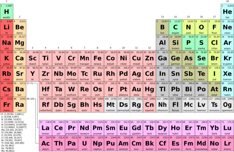 | Keywords: Periodic table simple pl.svg en Simple periodic table with localized element names and standard atomic weights IUPAC 2009 Temporarily converted to paths till fixing Wikipedia s font problem with DejaVu Sans Condensed but also the previous version of this image works correctly outside of Wikipedia 2013-11-04 01 25 49 own LĂĄszlĂł NĂ©meth Source code ; Created in LibreOffice 4 1 2 with this LibreLogo program ; Usage Put this code into an English language document in LibO Writer ; fix one program line for older LibreOffice versions see FIXME in the code ; and click on the Start icon of the View»Toolbars»Logo toolbar ; NEED INTERNET CONNECTION TO RUN THIS PROGRAM table data downloaded from Wikipedia lang input Language af ca cs de el en et fi fr it nl pt pt-br bw int input Color 0 COLORED 1 BLACK/WHITE ; Source pages http //www wikidata org/wiki/Q13584100 ; data fields Wikipedia page column of element names sorting by this column optional sources ru D0 A1 D0 BF D0 B8 D1 81 D0 BE D0 BA_ D1 85 D0 B8 D0 BC D0 B8 D1 87 D0 B5 D1 81 D0 BA D0 B8 D1 85_ D1 8D D0 BB D0 B5 D0 BC D0 B5 D0 BD D1 82 D0 BE D0 B2 2 fr Liste_des_ C3 A9l C3 A9ments_chimiques 2 de Liste_der_chemischen_Elemente 1 3 el CE 9A CE B1 CF 84 CE AC CE BB CE BF CE B3 CE BF CF 82_ CF 87 CE B7 CE BC CE B9 CE BA CF 8E CE BD_ CF 83 CF 84 CE BF CE B9 CF 87 CE B5 CE AF CF 89 CE BD_ CE BA CE B1 CF 84 CE AC_ CE B1 CF 84 CE BF CE BC CE B9 CE BA CF 8C_ CE B1 CF 81 CE B9 CE B8 CE BC CF 8C 2 it Elementi_per_numero_atomico 2 hu K C3 A9miai_elemek_list C3 A1ja 3 ca Llista_d 27elements_per_nombre_at C3 B2mic 2 no Grunnstoffliste 2 cs Seznam_chemick C3 BDch_prvk C5 AF 3 uk D0 A1 D0 BF D0 B8 D1 81 D0 BE D0 BA_ D1 85 D1 96 D0 BC D1 96 D1 87 D0 BD D0 B8 D1 85_ D0 B5 D0 BB D0 B5 D0 BC D0 B5 D0 BD D1 82 D1 96 D0 B2 2 et Keemiliste_elementide_loend 2 nl Lijst_van_elementen 2 3 fi Luettelo_alkuaineista 2 3 eo Listo_de_kemiaj_elementoj_la C5 AD_atomnumero 3 pt Anexo Lista_de_elementos_qu C3 ADmicos 2 sv Lista_ C3 B6ver_grund C3 A4mnen 2 3 af Lys_van_elemente_volgens_atoomgetal 2 pl Pierwiastki_chemiczne_wed C5 82ug_liczby_atomowej 2 IF lang en langpage sourceslang 20 langfield sourceslang 21 ; column with element names on the Wikipedia page IF COUNT sourceslang 2 3 langsort sourceslang 22 langsort 0 GLOBAL annotation posx posy size font font2 lang font DejaVu Sans font2 DejaVu Sans Condensed ; Wikimedia has got problem with it convert the result to path in Inkscape if needed posx 30 posy 40 size 42 ; load and process element data from Wikipedia embedded Python exec import urllib request exec data urllib request urlopen http //en wikipedia org/w/index php action raw title List_of_elements readlines exec table for j in i decode utf-8 replace style \\\ background-color 0x replace \\\ split for i in data if re match \ \d+ \ \ i decode utf-8 ; load and process other language data IF lang en exec data urllib request urlopen http // s wikipedia org/w/index php action raw title s readlines lang 2 langpage IF langsort > 0 exec langtable i decode utf-8 split d-1 split 0 split -1 strip \t split 0 split < 0 split 0 strip \t split -1 int i decode utf-8 split d-1 strip \t for i in data if re match \ \t \d+ \t \ \ i decode utf-8 langfield langsort exec import operator exec langtable sort key operator itemgetter 1 exec langtable i0 for i in langtable IF lang no exec data i decode utf-8 replace replace encode utf-8 for i in data IF lang pl exec data i decode utf-8 replace 0 replace replace \x27 encode utf-8 for i in data exec langtable i decode utf-8 replace <td> replace </td> split d split / 0 strip split -1 split 0 for i in data if re match <tr><td> \ \d+ </td> \ \ i decode utf-8 langfield-1 langtable ; a few fixes table793 Mercury ; instead of Mercury element table117 24 31 ; Mg table257 55 85 ; Fe table637 157 3 ; Gd ; add missing positions TO the table FOR i IN RANGE 56 71 tablei5 i 56 4 tablei6 8 5 FOR i IN RANGE 88 103 tablei5 i 88 4 tablei6 9 5 IF lang pt OR lang pt-br FOR i in 1 HidrogĂ©nio/HidrogĂȘnio 7 Azoto/NitrogĂȘnio 8 OxigĂ©nio/OxigĂȘnio 10 NĂ©on/NeĂŽnio 18 Ărgon/ArgĂŽnio 33 ArsĂ©nio/ArsĂȘnio 34 SelĂ©nio/SelĂȘnio 36 CrĂpton/CriptĂŽnio 40 ZircĂłni/ZircĂŽni 42 MolibdĂ©nio/MolibdĂȘnio 44 RutĂ©nio/RutĂȘnio 51 AntimĂłnio/AntimĂŽnio 54 XĂ©non/XenĂŽnio 74 TungstĂ©nio/TungstĂȘnio 75 RĂ©nio/RĂȘnio 86 RĂĄdon/RadĂŽnio 93 NeptĂșnio/NetĂșnio 94 PlutĂłnio/PlutĂŽnio 97 BerkĂ©lio/BerquĂ©lio 99 EinstĂ©nio/EinstĂȘnio 103 LaurĂȘncio/LawrĂȘncio IF lang pt-br ptbr 1 ptbr 0 langtablei0-1 i1 split / ptbr ; helper functions TO width_of_last_object OUTPUT _ drawpage getByIndex _ drawpage getCount -1 getSize Width / 100 __MM_TO_PT__; IN PT END ; FIXME remove the space before the END TO delete_last_object _ drawpage remove _ drawpage getByIndex _ drawpage getCount -1 END TO element size d l18n bw PENUP POSITION posx + INT d5 size posy + FLOAT d6 size 1 2 HEADING 0 ; show group number IF INT d0 IN 1 2 4 5 6 7 8 9 21 22 23 24 25 26 27 28 29 30 IF lang in af ca en eo no pl pt pt-br sv FORWARD size/2 + size/5 LABEL 0 1 d5 FORWARD size/2 + size/5 LABEL 0 4 5 d5 groupname 1 I ŻA 2 II ŻA 3 III ŻB 4 IV ŻB 5 V ŻB 6 VI ŻB 7 VII ŻB 8 9 VIII ŻB 10 ź 11 I ŻB 12 II ŻB 13 III ŻA 14 IV ŻA 15 V ŻA 16 VI ŻA 17 VII ŻA 18 VIII ŻA d5 IF lang not in hu groupname SUB groupname FONTSIZE 10 LABEL 0 1 groupname BACK size/2 + size/5 IF bw FILLCOLOR WHITE FILLCOLOR INT d1 PENDOWN RECTANGLE size size 1 2 PENUP IF M IN d2 OR m IN d2 OR 2 < COUNT d2 FONTFAMILY font2 FONTFAMILY font FONTWEIGHT BOLD FONTSIZE size/2 1 TEXT d2 FONTWEIGHT UPRIGHT FONTFAMILY font BACK size 1 2/2-size/20 fontsiz 5 6 FONTSIZE size/fontsiz IF l18n name l18nINT d0 -1 name d3 if lang de name name lower LABEL 0 1 name fontdescratio 492/2048 ; DejaVu Sans Condensed IF width_of_last_object > size 0 95 delete_last_object FONTFAMILY font2 LABEL 0 1 name width width_of_last_object IF width > size 0 95 delete_last_object fontsiz2 size/f
