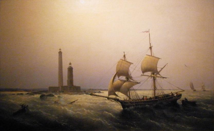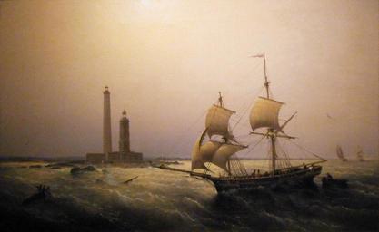 Keywords: Perot, Ferdinand - Le Phare de Gatteville.jpg 1839 oil on canvas Musée maritime de Tatihou conseil général de la Manche accession number object history credit line Exposition Visions romantiques des côtes de la Manche 2/12/2011 - 26/02/2012 Institution Musée Thomas-Henry Cherbourg own HaguardDuNord <span class signature-talk >talk</span> 2011-12-22 PD-Art Gatteville lighthouse Sailing ships in art Two-masted ships |