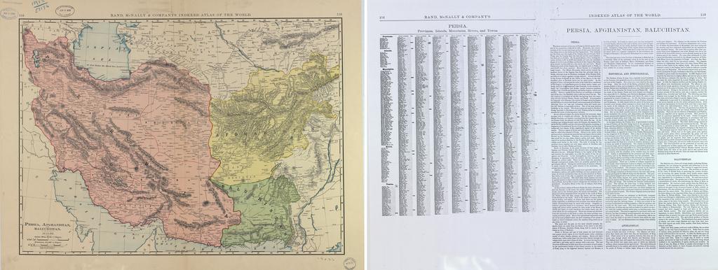 | Keywords: Persia, Afghanistan and Baluchistan WDL2678.png Artwork ru Пе сия Афганистан и Балучистан fr Perse Afghanistan et Balouchistan en Persia Afghanistan and Baluchistan zh 波斯 阿富汗和俾路支斯 pt Pérsia Afeganistão e Baluquistão ar بلاد فارس، أفغانستان وبلوشيستان ru Издательство Рэнд ак элли основанное в Чикаго стало к упнейшим в Соединенных Штатах п оизводителем атласов глобусов и путеводителей во вто ой половинеXIX века Данная ка та Пе сии как до 1935 года назывался И ан Афганистана и Белуджистана входила в издание 1898 года <i> Атласа ми а с указателями </i> <i>издательства Рэнд ак элли и Ко в кото ом соде жались к упные ка ты всех ст ан и админист ативных единиц ми а а также исто ические статистические и описательные данные в отношении каждой из них </i>Атлас состоит из двух томов В пе вом томе п иводятся ка ты Соединенных Штатов а во вто ом ка ты за убежных ст ан а данной ка те п иводится список п овинций ост овов го ек и го одов указанных на ка те а также к аткое описание изоб аженных на ка те ст ан Белуджистан г аничит с И аном на западе Афганистаном на севе е и омывается А авийским мо ем на юге В 325 году до Р Х в этом егионе асположенном на пути ма ш ута завоевательного похода в Индию побывал Александ акедонский В концеXIX века над егионом был установлен конт оль Великоб итании В 1947 году этот егион вошел в состав Пакистана fr Rand McNally basé à Chicago devint un important éditeur d'atlas de cartes de globes et de guides de voyage aux États-Unis durant la seconde moitié du 19ème siècle Cette carte de la Perse ainsi que l'Iran était connue jusqu'en 1935 de l'Afghanistan et du Baloutchistan provient de l'édition de 1898 <i>de Rand McNally Cos </i> <i>de l'Atlas indexé du monde contenant des cartes à grande échelle de chaque pays et de chaque division civile sur la surface du globe ainsi que des données historiques statistiques et descriptifs relatifs à chacun </i>L'atlas comporte deux tomes l'un avec des cartes des États-Unis l'autre avec des cartes de pays étrangers Cette carte dispose d'une liste des provinces des îles des montagnes des fleuves et des villes sur la carte ainsi que de brefs textes descriptifs sur les pays représentés Le Baloutchistan est une région délimitée par l'Iran à l'ouest l'Afghanistan au nord et la mer d'Arabie au sud Parcours historique de l'invasion de l'Inde il fut traversé par Alexandre le Grand en 325 avant JC la fin du 19ème siècle il passa sous contrôle britannique En 1947 il fut intégré au Pakistan en Chicago-based Rand McNally became a major publisher of atlases maps globes and travel guides in the United States in the second half of the 19th century This map of Persia as Iran was known until 1935 Afghanistan and Baluchistan is from the 1898 edition of <i>Rand McNally Cos </i> <i>Indexed Atlas of the World Containing Large Scale Maps of Every Country and Civil Division upon the Face of the Globe Together with Historical Statistical and Descriptive Matter Relative to Each</i> The atlas contains two volumes one with maps of the United States the other with maps of foreign countries This map features a list of the provinces islands mountains rivers and towns on the map as well as short descriptive essays about the countries depicted Baluchistan is a region bounded by Iran on the west Afghanistan on the north and the Arabian Sea to the south A historic invasion route to India it was crossed by Alexander the Great in 325 BC In the late 19th century it came under British control In 1947 it became part of Pakistan zh 19 世纪下半叶, 部设 加哥的兰德·麦克纳利成为 家出版 图册 图 球仪和旅行指南的重要美国出版商 这幅波斯(1935 年前伊 的旧称) 阿富汗和俾路支斯 图出自 <i>兰德·麦克纳利公司 Rand McNally Cos 1898 年版的</i> <i> 世界索引 图集 ,包括全球 国家和内部行政区的大比例尺 图以及与各国 关的历史 统计和描述 信息 </i>该 图集包括两卷,其中 卷是美国 图,另 卷是国外 图 该 图上还 份 份 岛屿 山脉 河流和城镇的列表以及多篇 关 绘国家的 短描述 俾路支斯 是 片西边与伊 北边与阿富汗 南边与阿拉伯海接壤的 区 该 区是历史上入侵印度的古路线,公元前 325 年亚历山大大 曾穿越该 区 19 世纪 , 该 区被英国控制 1947 年,该 区被纳入巴基斯 的版图 pt A Rand McNally com sede em Chicago tornou-se uma das principais editoras de atlas mapas globos e guias de viagem dos Estados Unidos na segunda metade do século XIX Este mapa da Pérsia como o Irã era conhecido até 1935 Afeganistão e Balusquistão é da edição de 1898 da <i>Rand McNally Cos </i> <i>Atlas Mundial Indexado Contendo Mapas em Grande Escala de Todos os Países e Jurisdições Civis Sobre a Face do Globo Juntamente com Assuntos Históricos Estatísticos e Descritivos Relativos a Cada Um Deles</i> O atlas contém dois volumes um com mapas dos Estados Unidos e o outro com mapas de países estrangeiros Este mapa apresenta uma lista das províncias ilhas montanhas rios e