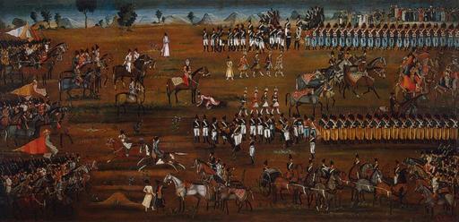Keywords: Persian Military Review with Fath Ali Shah and Abbas Mirza.jpg Commonist Persian 19th Century Soldiers Oil on canvas 203x415 cm Iran Qajar Dynasty Circa 1815/1816 A multifigure composition spreads across this huge canvas depicting a real event which took place in the Ujan valley in July 1813 the heir to the Iranian throne Abbas Mirza showing his father Fath Ali Shah the regular army newly reorganized along European lines by English and French instructors In the upper half of the painting left of centre is a rider in red Fath Ali Shah himself and at his horse's feet a figure in pink prostrating up on the ground - Abbas Mirza The ruler of Azerbaijan the most important and the richest province in Iran Crown Prince Abbas Mirza makes the lowest possible bow of the kind made even to the ruling shah only on special occasions The Shah and his numerous suite are preparing to pass between the ranks of soldiers wearing uniforms of European type By the right edge of the painting are musicians on camels and to the left - riders leading horses in rich trappings Further left are eight noble youths wearing head-dresses with feathers arranged in two rows these are the fast runners who always accompanied the ruler when he left the palace to clear the way before him At the very top right are the Ulema theologians and tutors in law in turbans and long robes with a group of people performing a ritual sacrifice of rams The painting formed part of the decoration of the Ujan castle of Abbas Mirza from where in 1828 it was removed by the Russians as a war trophy and brought to the Winter Palace in St Petersburg http //warfare uphero com/Persia/19thC/Persian_19th_Century_Soldiers htm circa 1815 -16 author PD-Art Battles in art Military history of the Qajar dynasty Abbas Mirza Qajar Military use of camels Animal sacrifice in Iran |