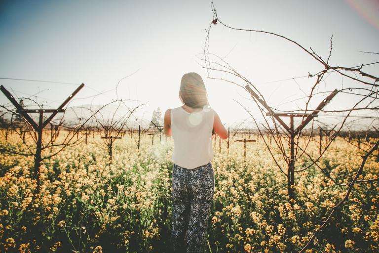 Keywords: person female girl young woman back view fields summer sunlight bright looking lifestyle enjoying flowers
