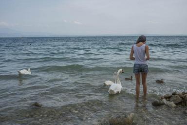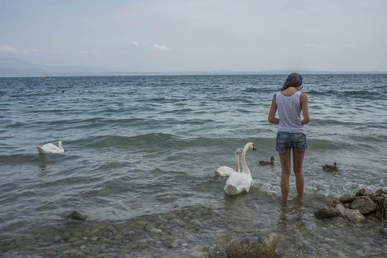 Keywords: person girl feeding swans birds duck nature wildlife white lake garda outdoors summer caucasian people happy woman healthy