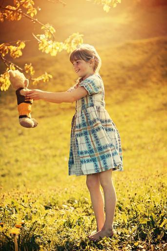 Keywords: person human child girl dress teddy teddy bear out nature play happy late summer portrait lighting