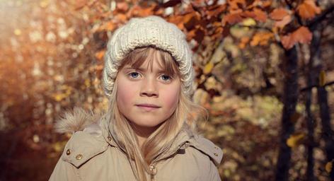 Keywords: person human child girl blond cap autumn out nature walk fall leaves sunlight autumn light portrait close