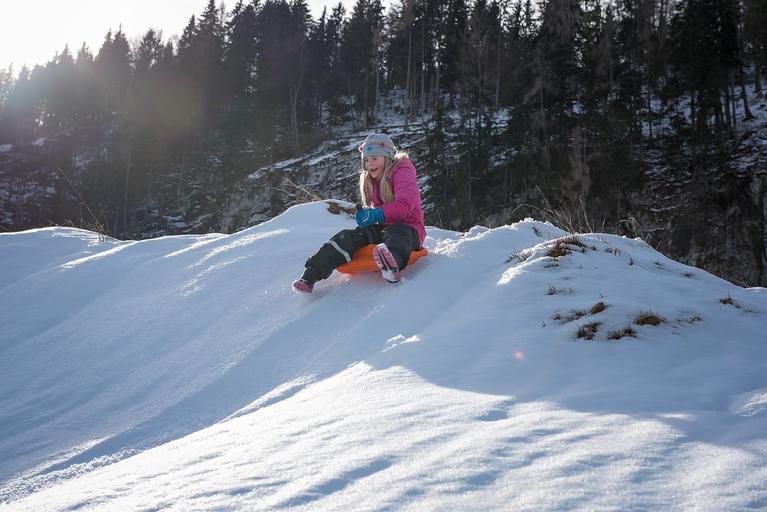 Keywords: person human child girl ride on bob slip downhill winter snow fun winter fun in motion in action