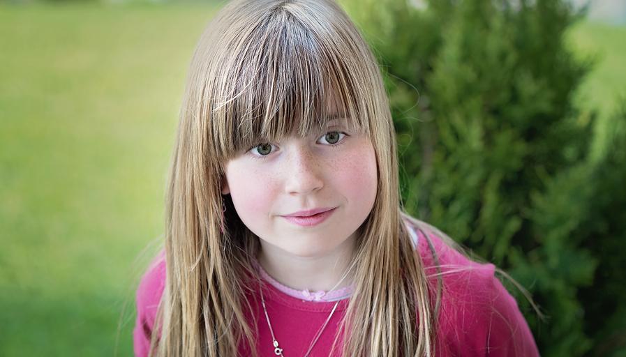 Keywords: person human child girl blond long hair face view green out portrait