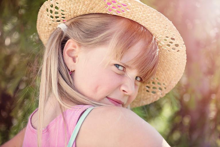 Keywords: person human child girl face blond view hat keck portrait close