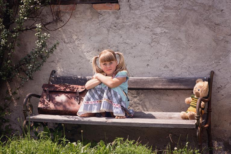 Keywords: person human child girl blond bank wooden bench schoolbag leather case teddy teddy bear rest click out nature portrait