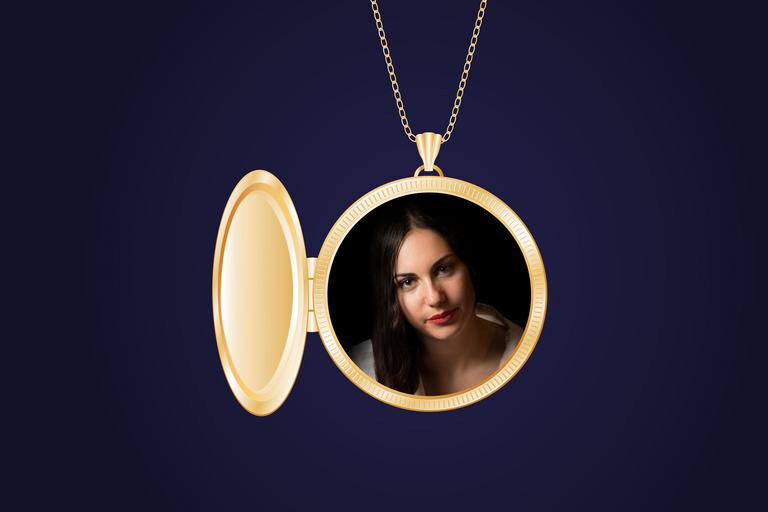 Keywords: person human female portrait of woman photo medallion jewellery mistress love pendants folding pops up for miniature portrait memory loved one at the heart of bear very personal emotional jewelry gold golden chain gold chain graphic