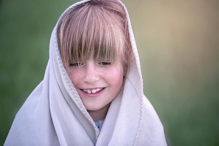 Keywords: person human female girl face view blanket wrapped up portrait close