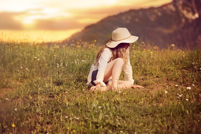 Keywords: person human female girl hat meadow grass nature sunset lighting portrait