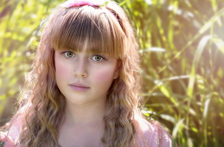 Keywords: person human female girl blond long hair curly hair face nature out portrait close
